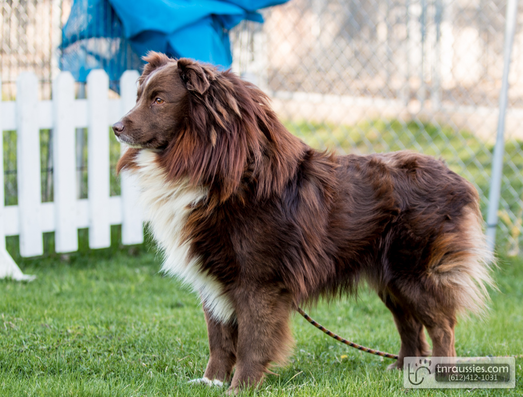 Pyro is a gorgeous eye catching dark red tri. He has correct conformation, moderate bone and moves very nicely. Pyro can be a bit reserved when you first meet him, but warms up quickly. He has a sweet personality and loves to please. Pyro combines some of the best working lines known for natural ability,